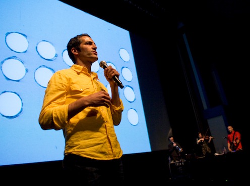 conventional documentary, but that didn’t hurt the experience. Green stood beside the screen and narrated live, using a remote control to move from one slide or video clip (mostly video clips) to another. Cerf DJ’d the pre-recorded music off-stage (they’ve used live musicians in other screenings/presentations). Green’s thoughtful commentary discussed Esperanto, Communism (clearly the biggest utopian disaster of the century), and shopping malls. The questions in the Q&A afterwards were more about utopias and ideas than about the documentary, which is high praise. But one woman asked if they’d consider creating a canned version, perhaps filmed before a live audience, to make it more readily available. They seemed reluctant to do so, but I hope they change their minds.