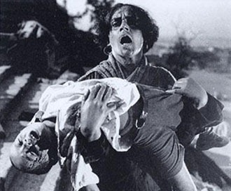 sequence that I hesitate to discuss if further–it’s like deconstructing Hamlet’s "To be or not to be" soliloquy. But I will add one thing that caught my notice last night: It’s the only character-driven scene in the movie. Within the space of those few minutes, Eisenstein lets us get close to and identify with several of the victims. There’s the young, scholarly-looking man, the elderly woman and her daughter, and most heart-breaking of all, the woman who sees her child shot down and trampled upon.