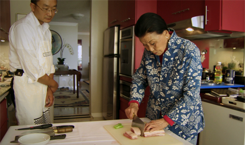 What little information we get is concentrated into that first part of this three-part, 78-minute feature. The second section shows her supervising a staff of professional cooks preparing a lavish banquet for friends in her apartment. Very little is explained. We see mostly extreme close-ups of knives chopping food. The knives are handled with exceptional skill, but you can only watch so much of this sort of thing.