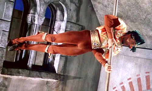 And it’s not only Lancaster. Nick Cravat was Lancaster’s acrobatic partner in their youth, and became the star’s personal trainer. Here he plays the sidekick, and the two of them do great physical feats together. In one extended sequence, they find one amazing thing to do after another with a very long pole. One holds it while the other climbs, they walk on it like a tightrope, trip bad guys, and knock out some palace guards.