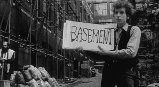 “Subterranean Homesick Blues” also opens the movie in one of the most famous precursors of the rock video: As that influential song plays on the soundtrack, Dylan stands shyly and somewhat embarrassed in an alley holding up cue cards with bits of the lyrics–and some puns built around the lyrics .