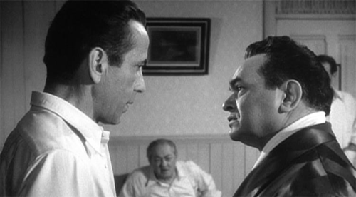 In the 1930’s, movie stars like Edward G. Robinson got to kill punk character actors like Humphrey Bogart. But by 1948, Bogey was the top star and Robinson the supporting player (and a great one). Set in a lonely Florida hotel during a hurricane, war veteran Bogart faces off against gangster Robinson. Most of the movie is talk, but when Richard Brooks and Huston himself adopt a Maxwell Anderson stage play, and Huston directs a solid and charismatic cast, who needs more than talk?