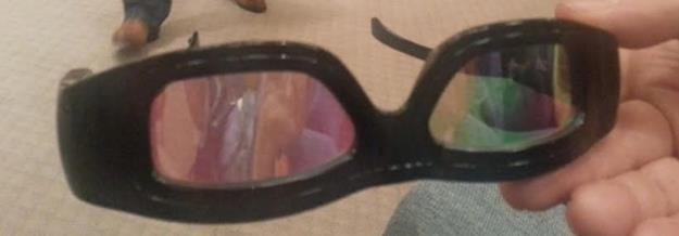 Like the earliest versions of projected 3D, Dolby 3D uses colored lenses to control what light reaches what eye. (The technical term is anaglyph.) If you look at Dolby 3D glasses from the right angle, you can see the magenta and green in the lenses.