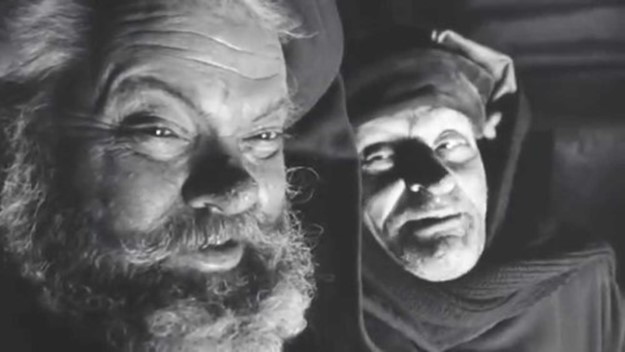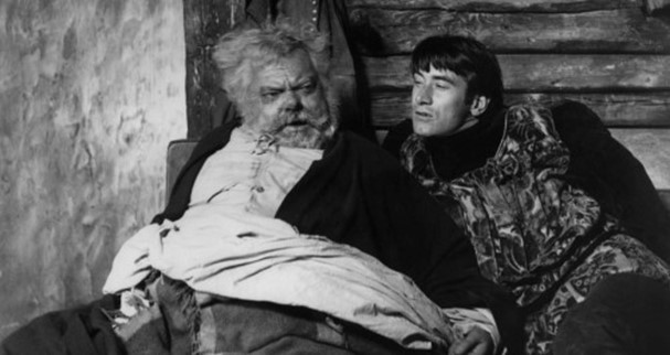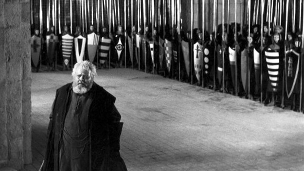 And through that battle, Welles provides comic relief as a Falstaff in absurdly fat armor, trying to find the safest spot on the battlefield. And his words condemn the romantic view of war: ” What is that honour? Air. A trim reckoning! Who hath it? He that died o’ Wednesday.”