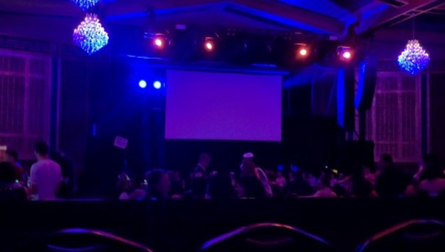 As near as I can tell, they screened Rocky Horror off a DVD. Maybe it was a Blu-ray, but I doubt it. The excellent Meyer sound system was cranked up to eleven, which was fine for the songs but uncomfortable for the dialog. The UC used its lightshow capabilities to enhance the movie. For instance, when someone on screen took a flash photo, a light above the screen flashed, as well.