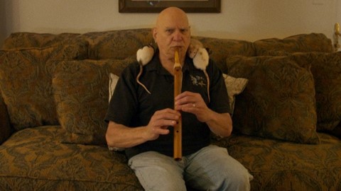 Rat Film doesn’t spend much time on pet rats, but it spends some. We see a man look straight into the camera, playing music, while his furry friends sit on his shoulders. In a longer sequence, a couple explain how they rat-proof their living room before letting their pets out of the cage.