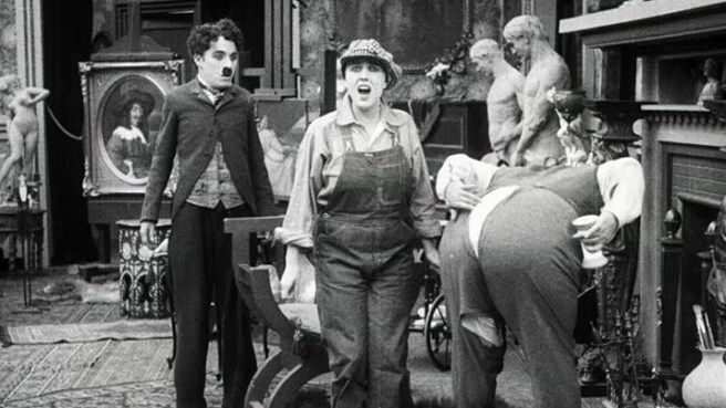 As he did in His New Job, Chaplin uses the movie studio itself to mine gags. Charlie is an assistant prop man (yes, it’s another work comedy), and Campbell, of course, is his boss. The evil boss spends most of his time sleeping in a chair, while Charlie does all the work, which includes carrying some nine chairs and a piano, and shampooing a bear-skin rug. But whenever the boss’s boss comes by, Campbell is standing up and Charlie is sleeping. Guess who gets the beatings.