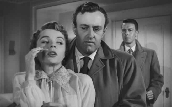 On the other hand, John Dall is just fine as Cobb’s kid brother, just promoted to detective, working under his brother on his very first case. And yes, it’s the case of the murdered husband. Their sibling relationship is the best thing in the movie. The elder cop is trying intentionally to set his kid brother in the wrong direction. But every time Dall’s character makes the right deduction, his big brother feels both frightened and proud.