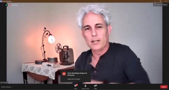 Dan Kamin moderated the event. Unlike a regular Zoom discussion, there was only one face on the screen at a time – either Kamin’s or Robinson’s. The rest of us could ask questions in an orderly manner. Some highlights, edited for clarity, brevity, and how fast I can type: