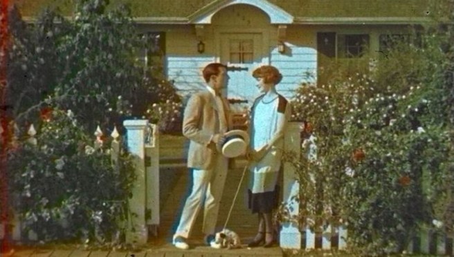 The print was a disappointment. When it was new, Seven Chances started with a Technicolor prologue – something rare at the time. Last Saturday night In Niles, the Technicolor scenes were on 16mm, with tints instead of actual color. The rest of the film was in black & white 35mm. The print looked dull. Worst of all, the intertitles were in French at the top of the screen and in English at the bottom, and in both languages the lettering was extremely dark. My Blu-ray of Seven Chances has its problems, but it’s far better than the 16 and 35mm prints used at Niles.